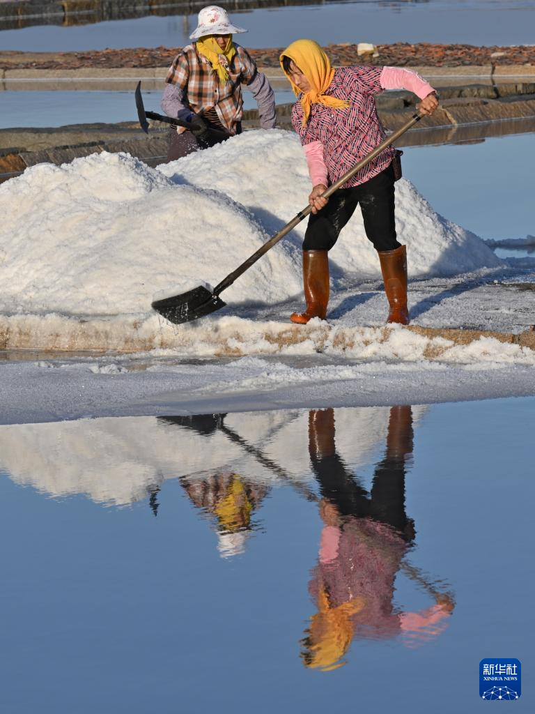 11月8日,盐工在盐田里劳作。(新华社记者 姜克红 摄)