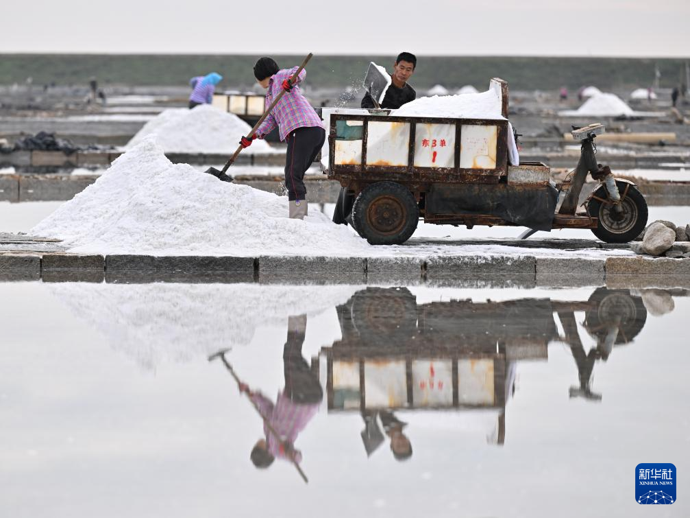 11月8日,盐工在进行堆坨作业。(新华社记者 姜克红 摄)