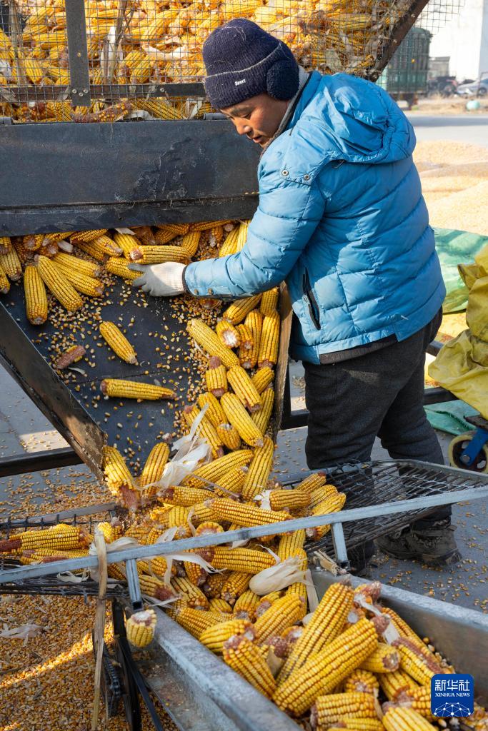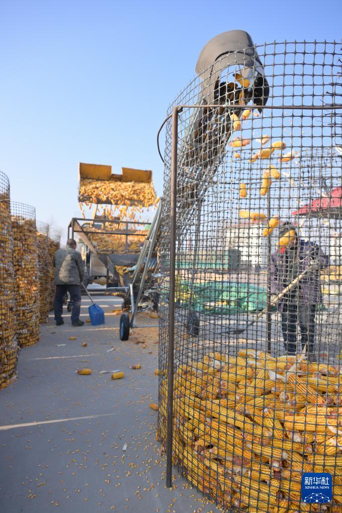 11月13日,在黑龙江省肇东市一处秋粮晾晒场,海城双丽现代农机专业合作社的农民在堆放玉米。(新华社记者 丁赫 摄)