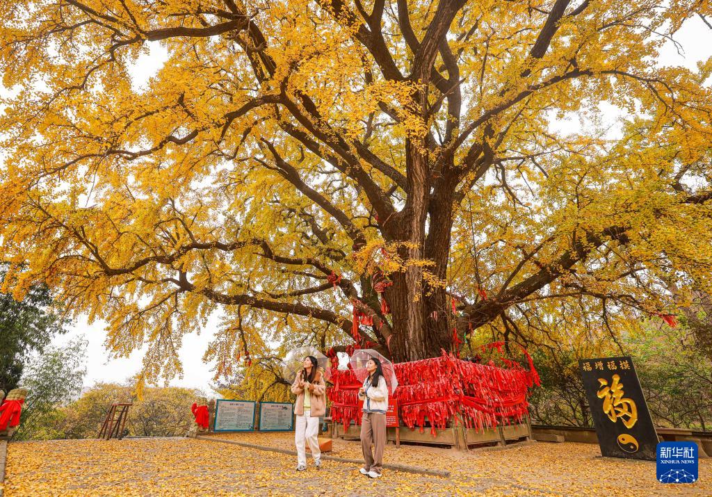 11月14日,游客在山东省荣成市伟德山森林公园一棵古银杏树下游玩。(新华社发 李信君 摄)