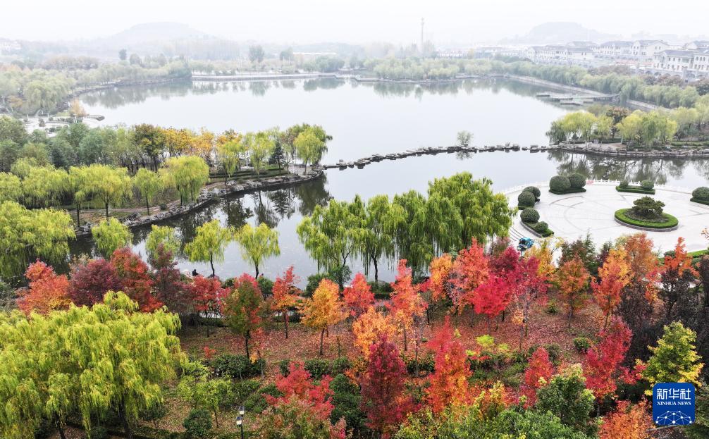 11月14日拍摄的山东枣庄山亭区紫云湖公园初冬景色(无人机照片)。(新华社发 李宗宪 摄)
