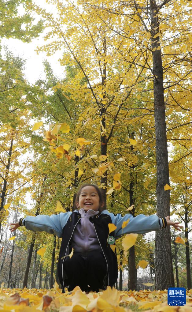 11月14日,一名小朋友在河南省焦作市温县子夏公园银杏林里嬉戏玩耍。(新华社发 徐宏星 摄)