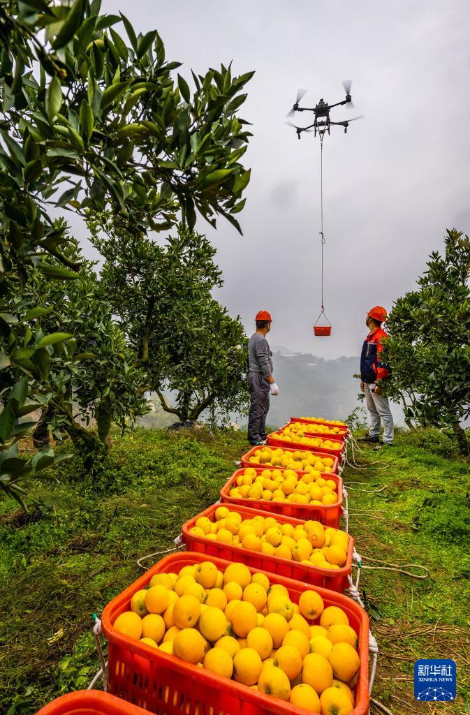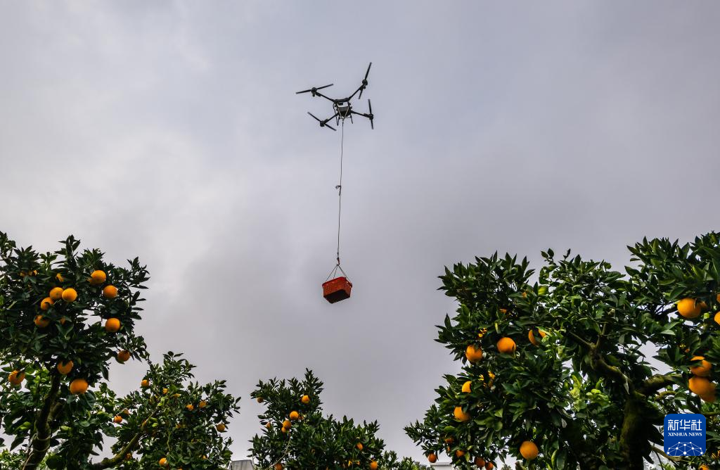 11月14日,技术人员在秭归县郭家坝镇百日场村用无人机转运刚收获的脐橙。(新华社发 郑家裕 摄)