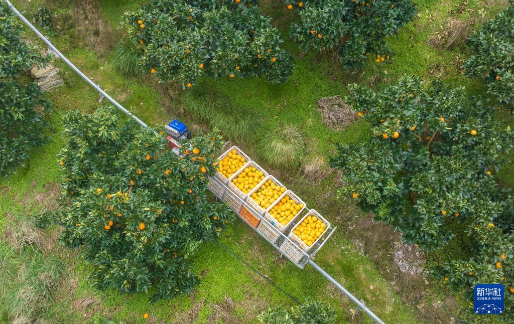 11月14日,秭归县郭家坝镇百日场村果农用田间单轨运输车转运脐橙(无人机照片)。(新华社发 郑家裕 摄)
