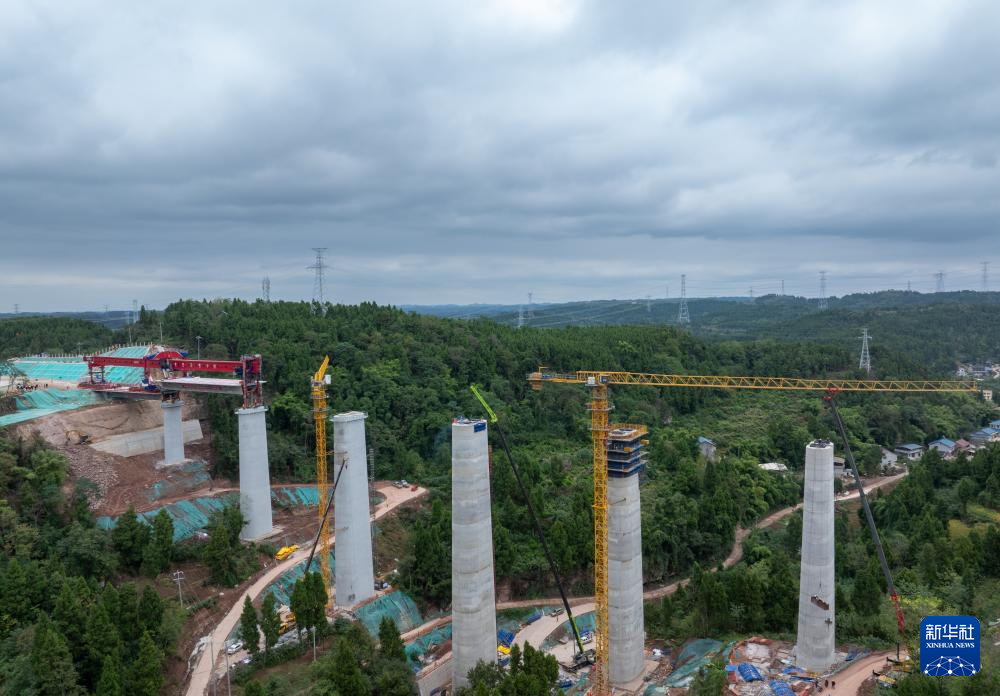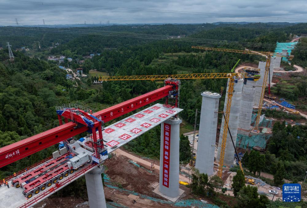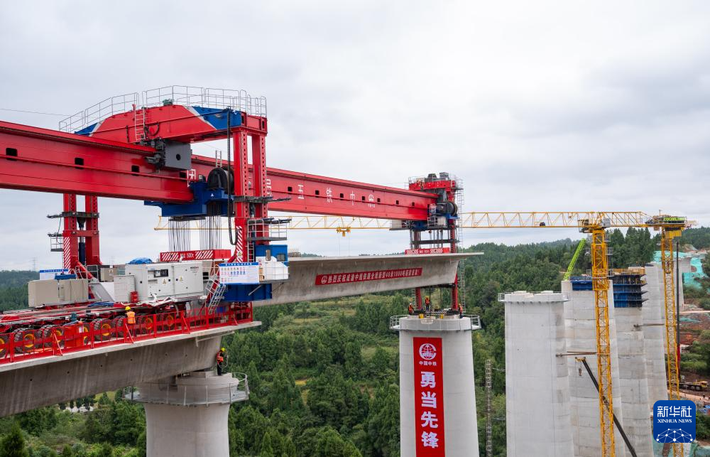 11月17日,中铁五局成渝中线高铁四川段项目部的架桥机将长40米、重千吨的箱梁架设在成渝中线高铁麻湾特大桥31-30号桥墩上。(新华社记者 江宏景 摄)