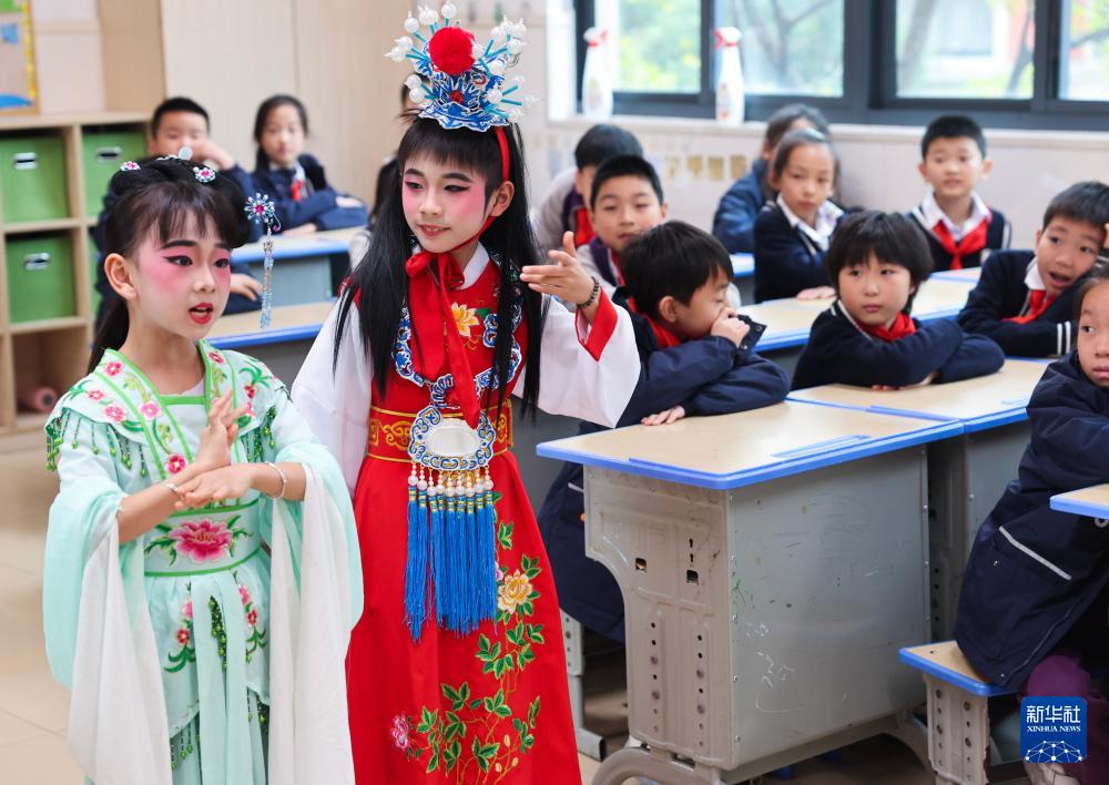 12月3日,诸暨市西湖小学越剧社团的学生演员在教室为同学们演出。(新华社记者 徐昱 摄)