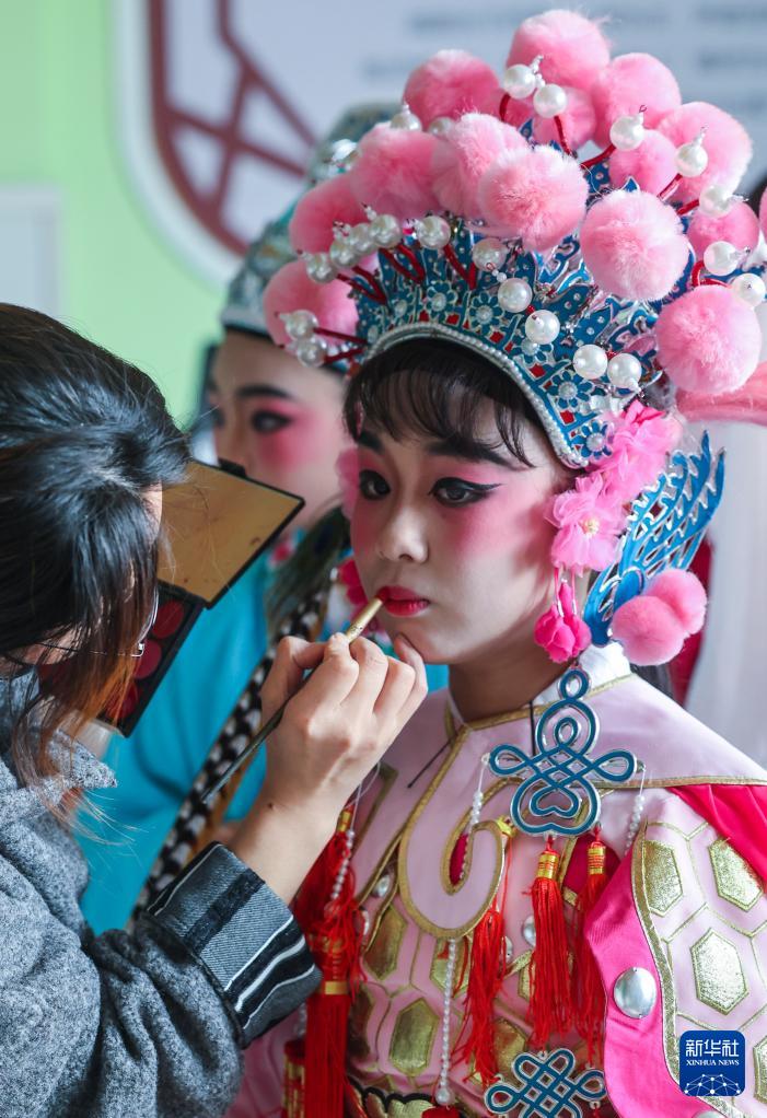 12月3日,在浙江省诸暨市西湖小学,指导老师在为越剧社团的学生演员化装。(新华社记者 徐昱 摄)