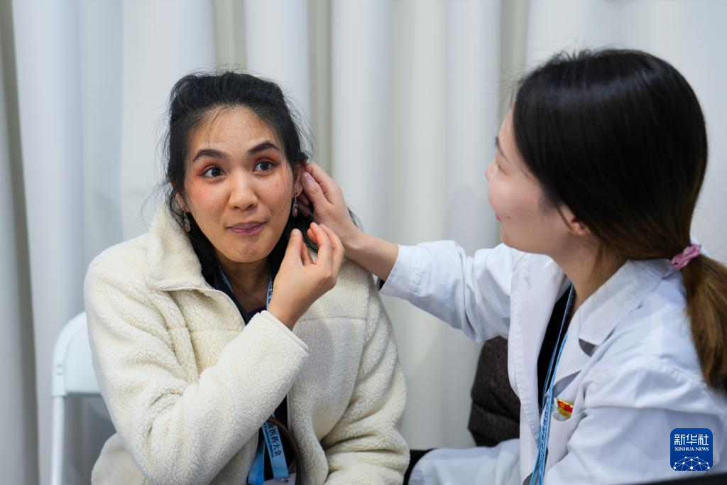 12月3日,在2024世界传统医药大会的中医药体验区,一名来自泰国的参会嘉宾(左)在首都医科大学附属北京中医医院的展位体验耳穴压豆。(新华社记者 鞠焕宗 摄)
