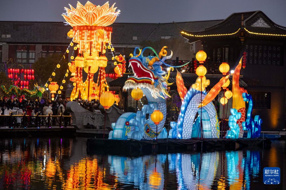 人们在江苏省泰州市姜堰区人民公园新春灯会上赏灯(2024年2月7日摄)。(新华社发 汤德宏 摄)