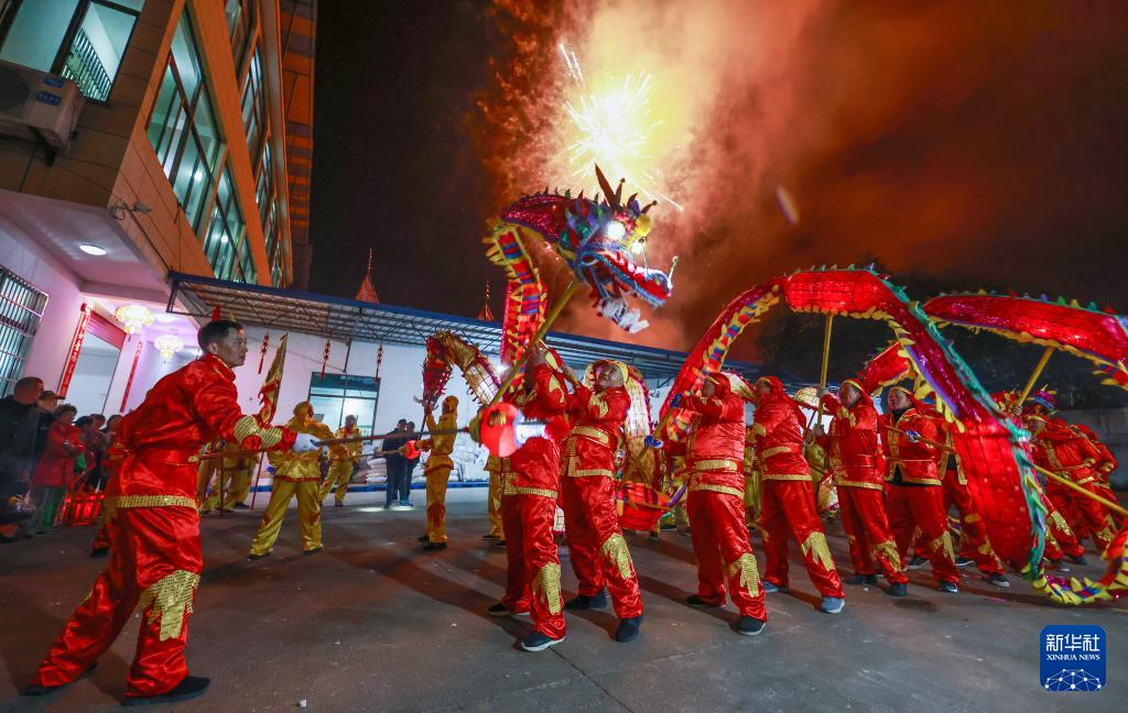 浙江省诸暨市安华镇矿亭村村民进行舞龙表演,庆祝春节(2024年2月10日摄)。(新华社记者 徐昱 摄)
