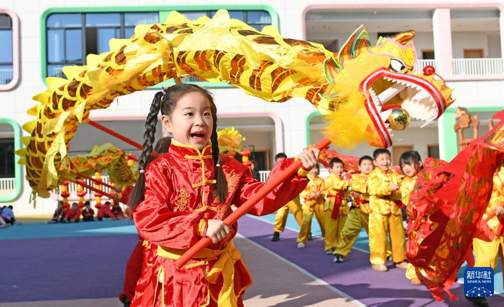 浙江省台州市仙居县迎晖幼儿园的小朋友在表演舞龙,喜迎龙年新春(2024年1月18日摄)。(新华社发 王华斌 摄)