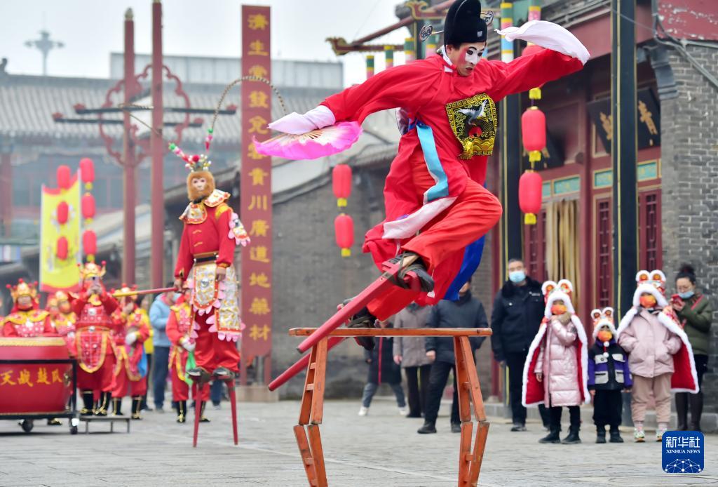 在河北省正定古城荣国府景区宁荣街,民间艺人进行踩高跷表演,喜迎春节(2022年1月27日摄)。(新华社发 张晓峰 摄)