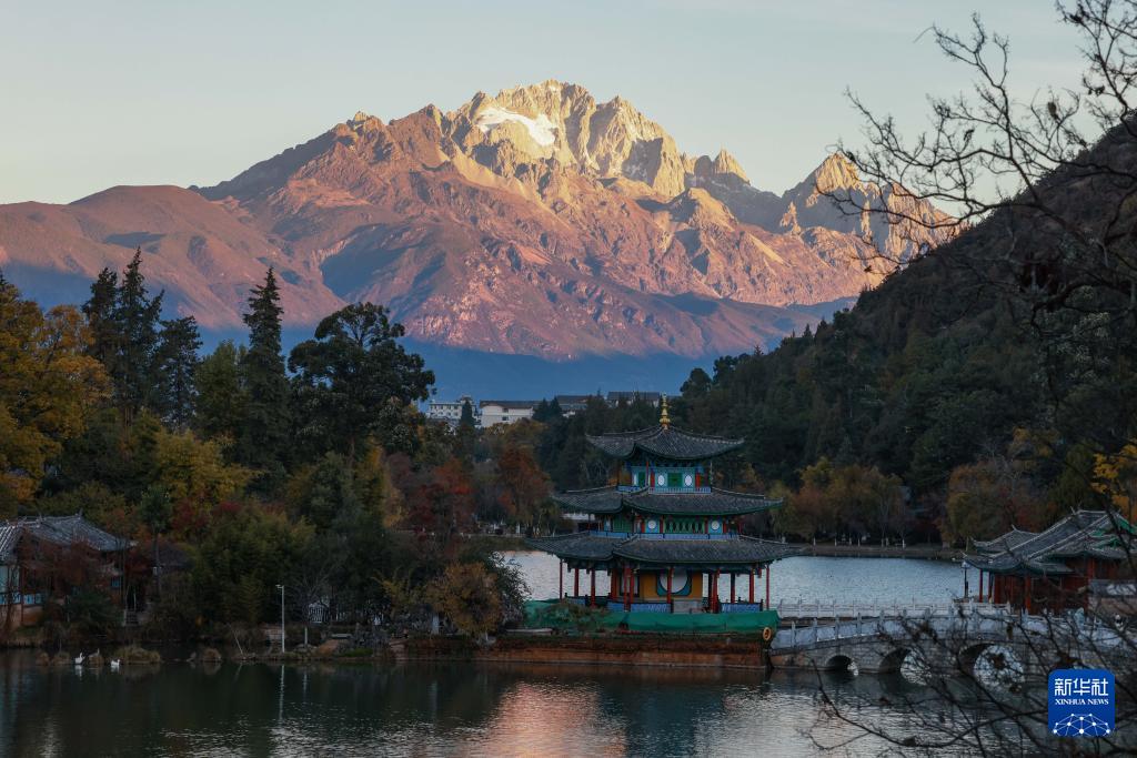 这是12月9日在丽江市黑龙潭公园拍摄的玉龙雪山“日照金山”美景。(新华社记者 孟涛 摄)