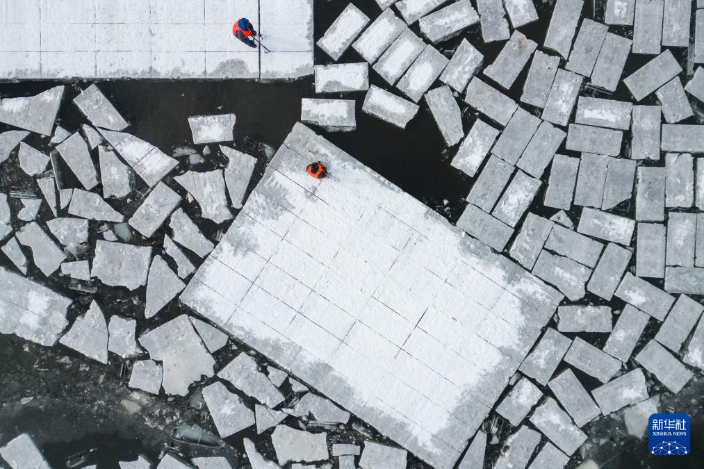 12月9日,工人在松花江哈尔滨段采冰(无人机照片)。(新华社记者 张涛 摄)