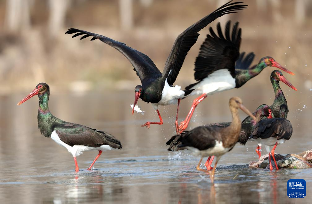 12月9日,黑鹳在河北省石家庄市平山县境内的冶河湿地嬉戏觅食。(新华社发 梁子栋 摄)