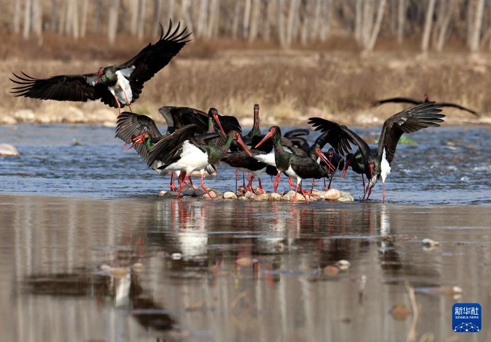 12月9日,黑鹳在河北省石家庄市平山县境内的冶河湿地嬉戏觅食。(新华社发 张晓峰 摄)
