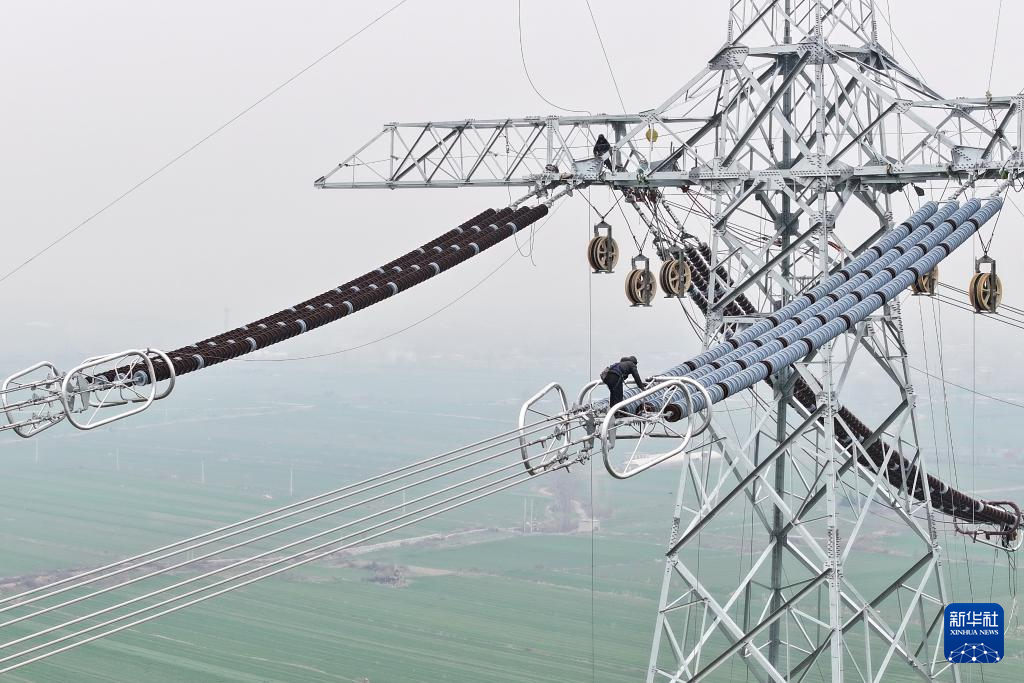 12月10日,工人在河北省磁县境内的陇东至山东800千伏特高压直流线路工程建设工地安装附件(无人机照片)。(新华社记者 杨世尧 摄)