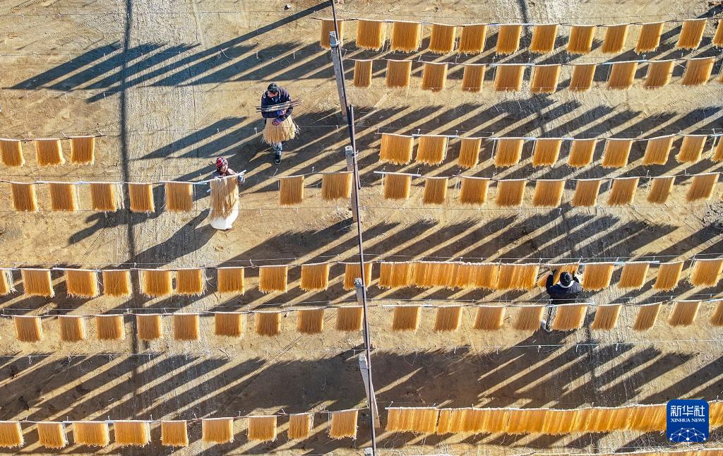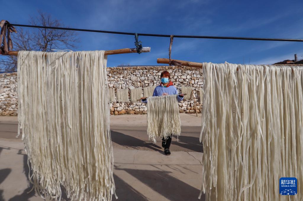 12月11日,河北省遵化市新店子镇万子峪村农民在庭院晾晒手工粉条。(新华社发 刘满仓 摄)