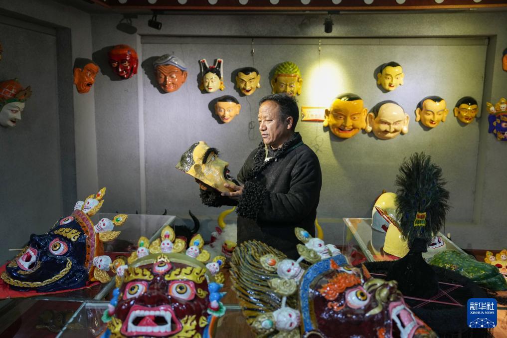 12月9日,西洛在合作社展览厅查看和同事们一起制作的西藏传统面具。(新华社记者 丁汀 摄)