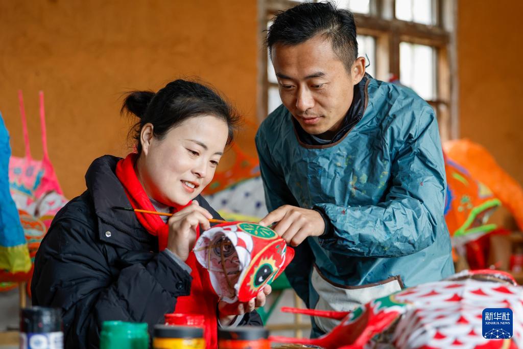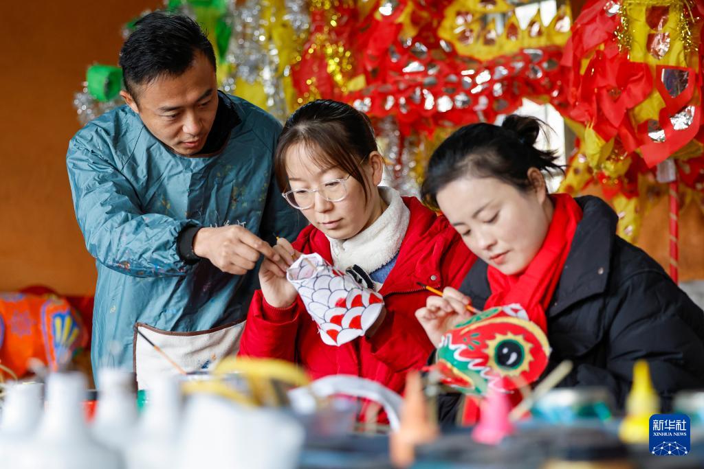 12月9日,在安徽省黄山市黟县宏村,何继星(右)指导学员制作花灯。(新华社记者 傅天 摄)