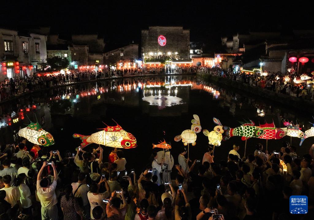9月15日,花灯表演队伍在安徽省黄山市黟县宏村巡游(无人机照片)。(新华社发 施亚磊 摄)