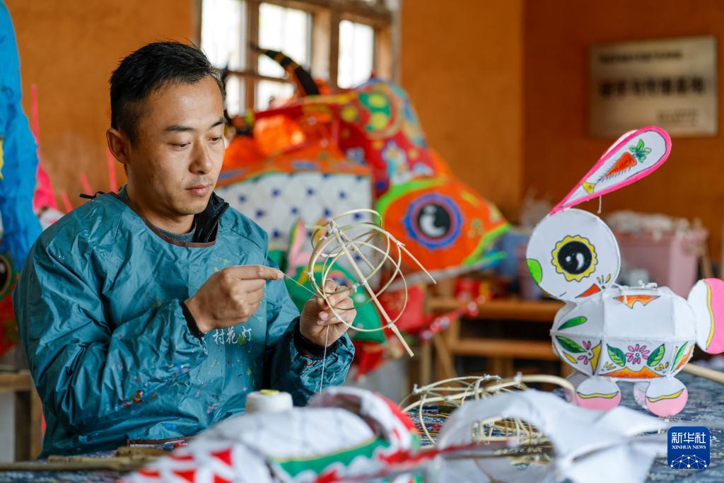 12月9日,在安徽省黄山市黟县宏村,何继星在制作花灯。(新华社发 施亚磊 摄)