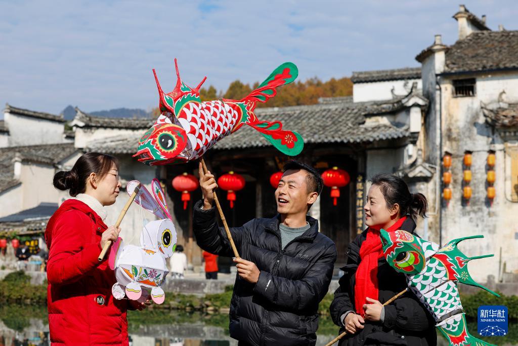 12月9日,在安徽省黄山市黟县宏村,何继星(中)和学员在查看花灯。(新华社发 施亚磊 摄)