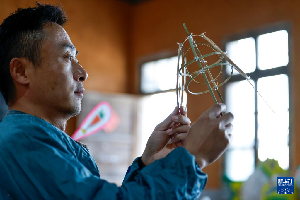 12月9日,在安徽省黄山市黟县宏村,何继星在制作花灯。(新华社记者 傅天 摄)