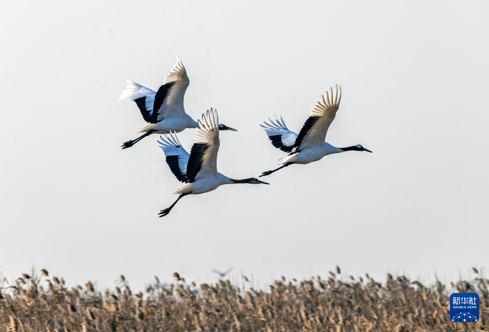 12月15日,丹顶鹤在江苏盐城湿地珍禽国家级自然保护区内飞翔。(新华社发 汤德宏 摄)