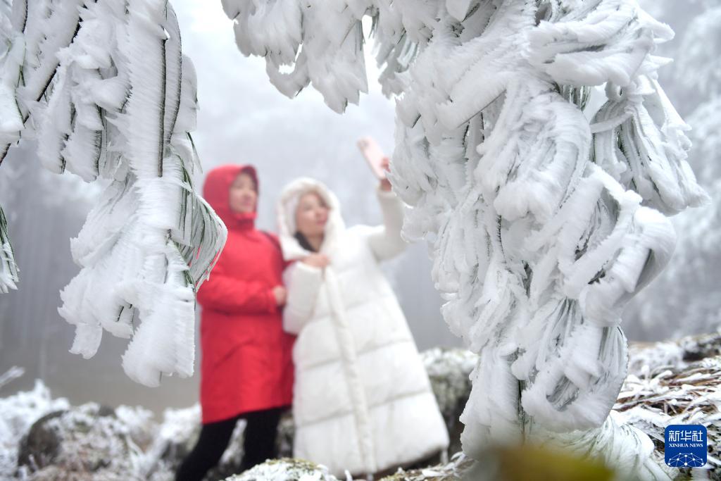 12月15日,游人在云南省文山壮族苗族自治州丘北县舍得乡欣赏雾凇美景。(新华社发 熊平祥 摄)