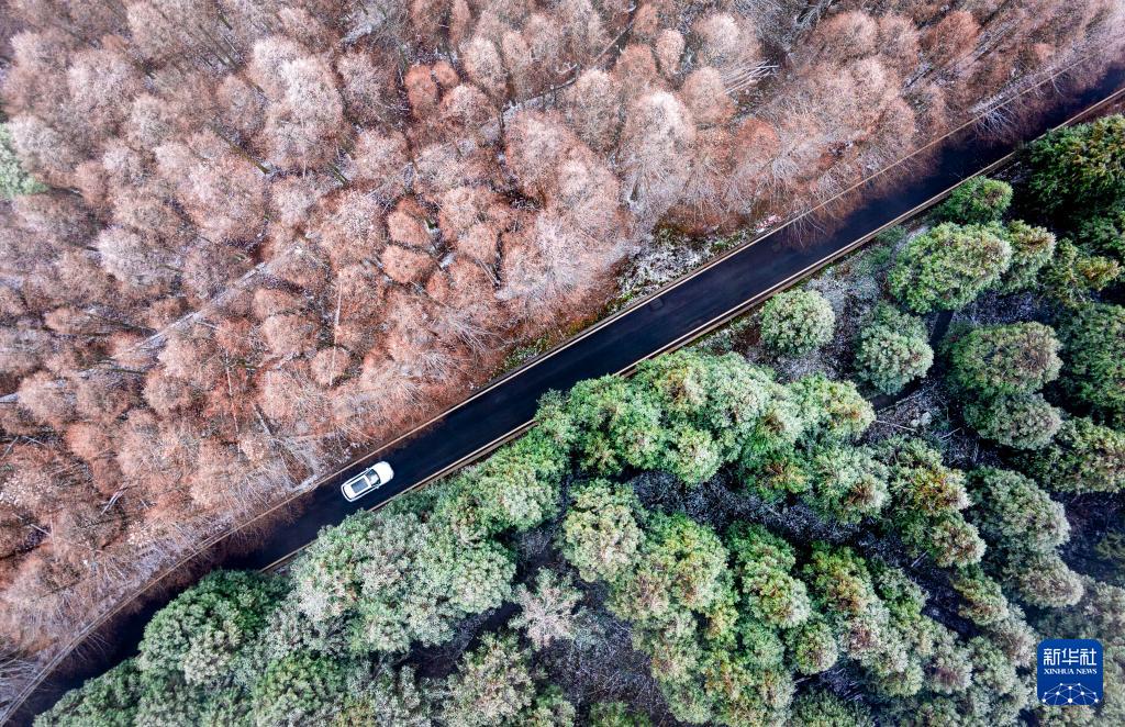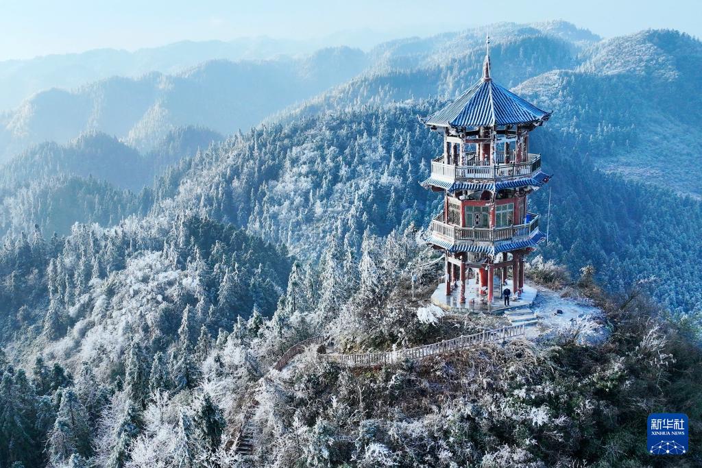 12月15日在重庆市酉阳土家族苗族自治县清华林场拍摄的雪后景色(无人机照片)。(新华社发 陈碧生 摄)
