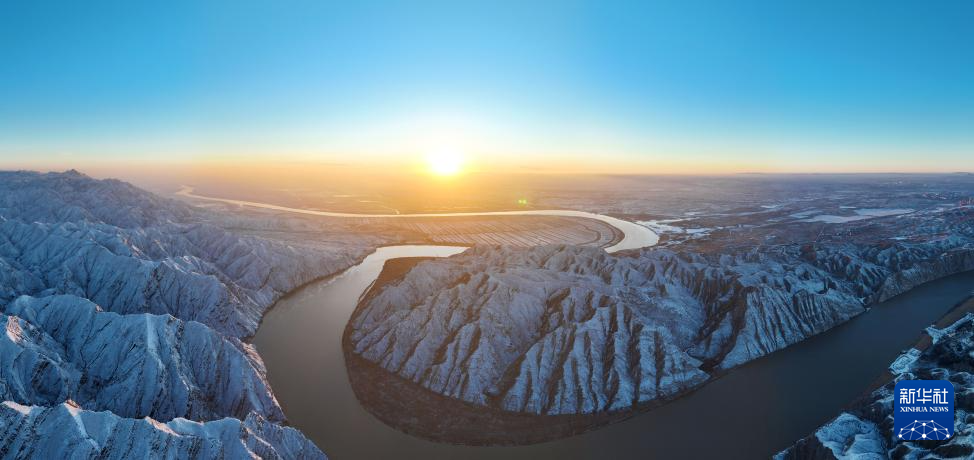 12月14日在宁夏回族自治区吴忠市青铜峡拍摄的雪后黄河景色(无人机照片)。(新华社发 袁宏彦 摄)