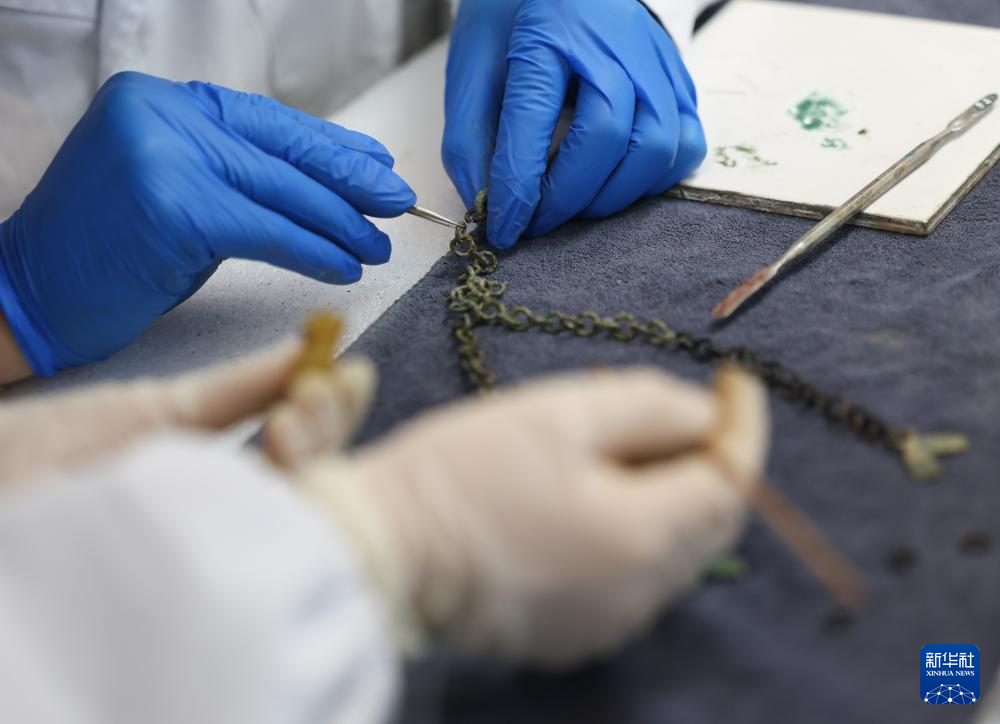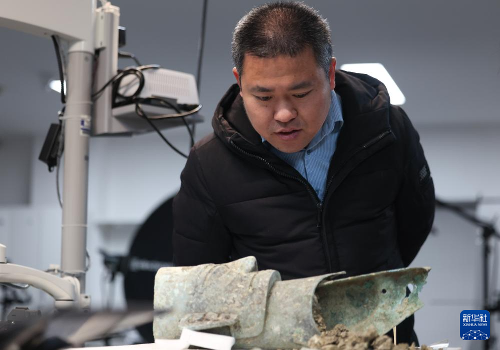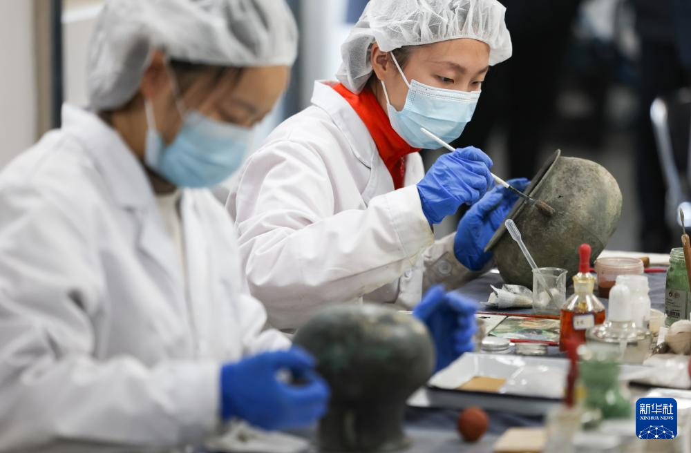 12月16日,三星堆研究院工作人员在修复青铜文物。(新华社记者 江宏景 摄)