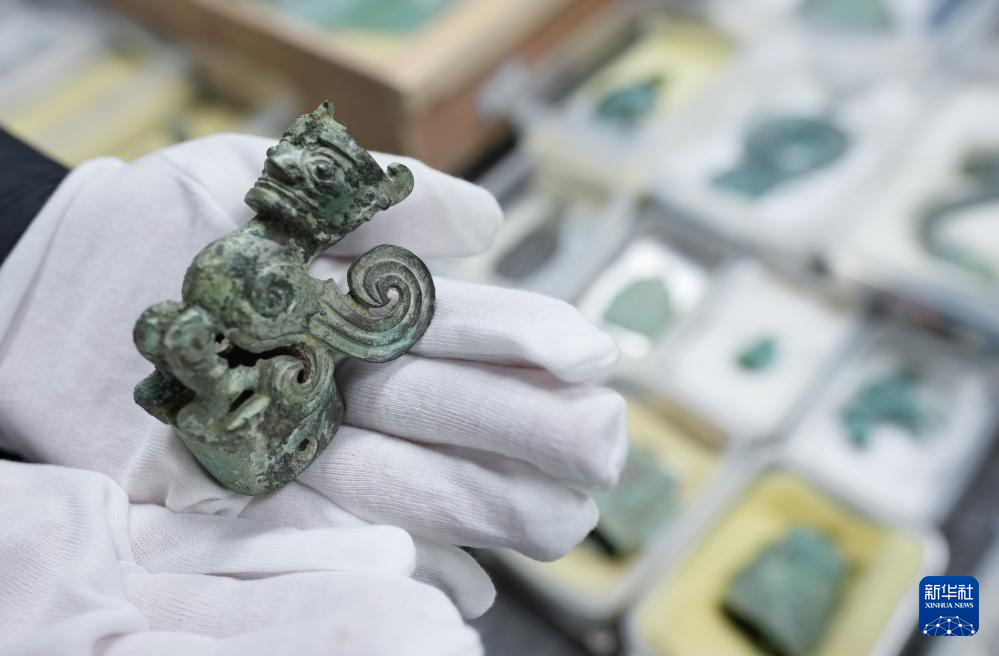 12月16日,三星堆研究院工作人员展示一件青铜文物。(新华社记者 江宏景 摄)
