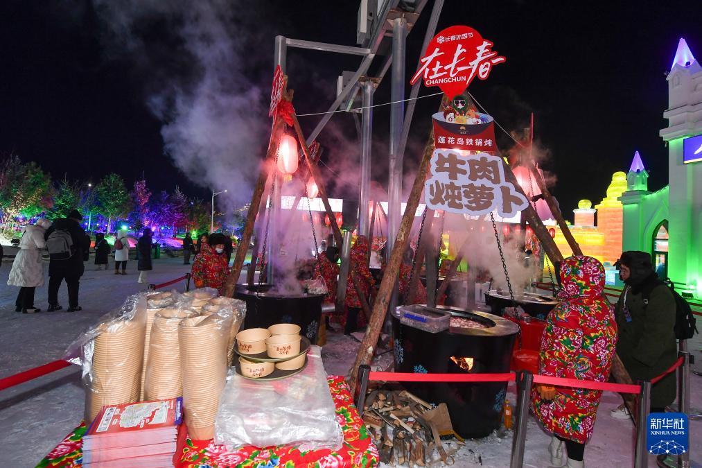 12月17日,工作人员在长春冰雪新天地制作特色美食。(新华社记者 张楠 摄)