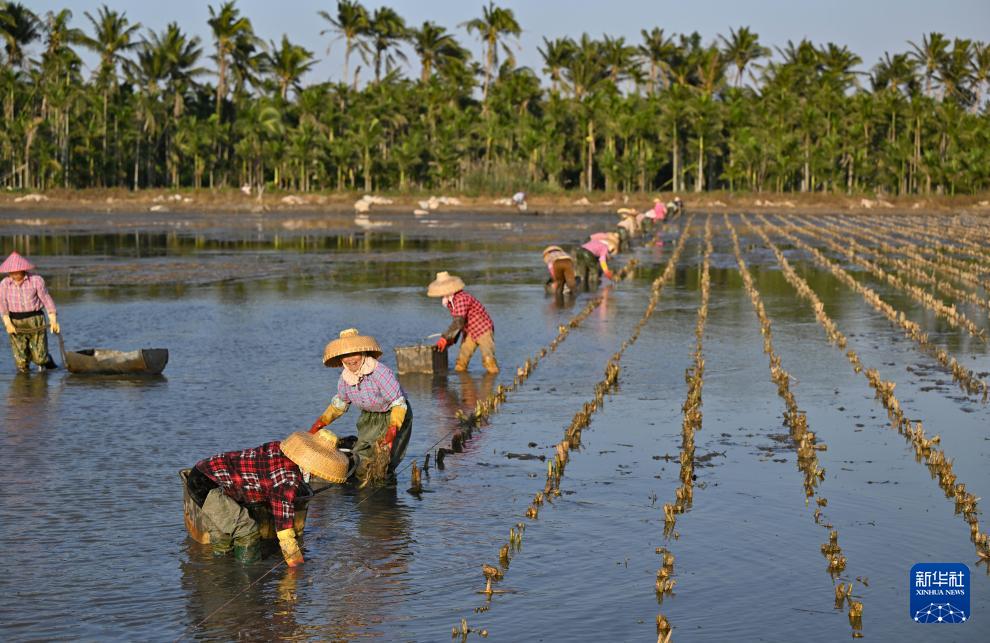 12月18日,农民在海口市琼山区七水洋蔬菜种植基地种植茭白。(新华社记者 郭程 摄)