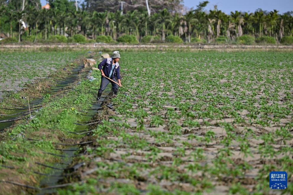 12月18日,农民在海口市琼山区大荒洋蔬菜种植基地进行田间管理。(新华社记者 郭程 摄)