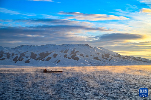 12月23日,一条小船在赛里木湖中驶过。(新华社记者 陈朔 摄)