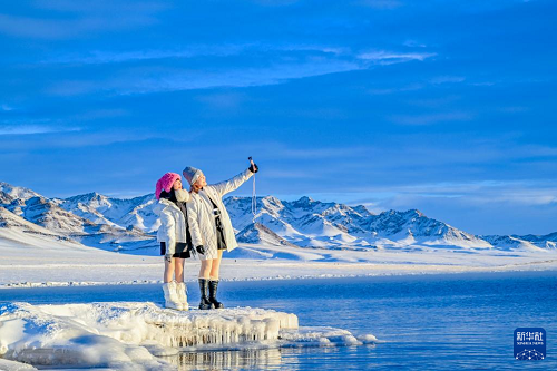 12月23日,游客在赛里木湖边自拍留影。(新华社记者 陈朔 摄)