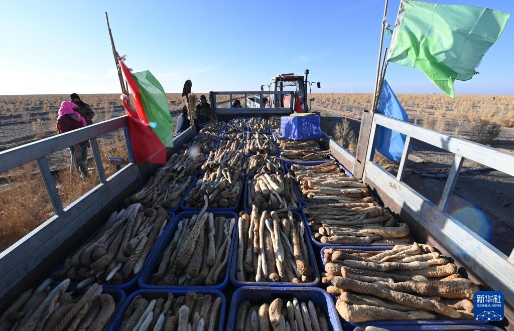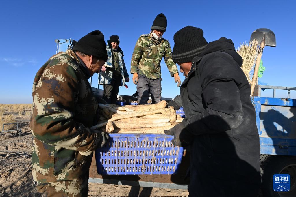 12月24日,在金塔县鼎新镇境内的巴丹吉林沙漠边缘,工人将采挖的肉苁蓉装车。(新华社记者 范培珅 摄)