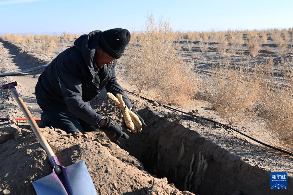 12月24日,在金塔县鼎新镇境内的巴丹吉林沙漠边缘,工人在采挖肉苁蓉。(新华社记者 范培珅 摄)