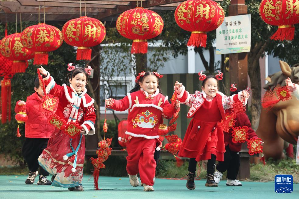 12月26日,在浙江省湖州市德清县中心幼儿园,孩子们参加传统民俗活动。(新华社发 倪立芳 摄)