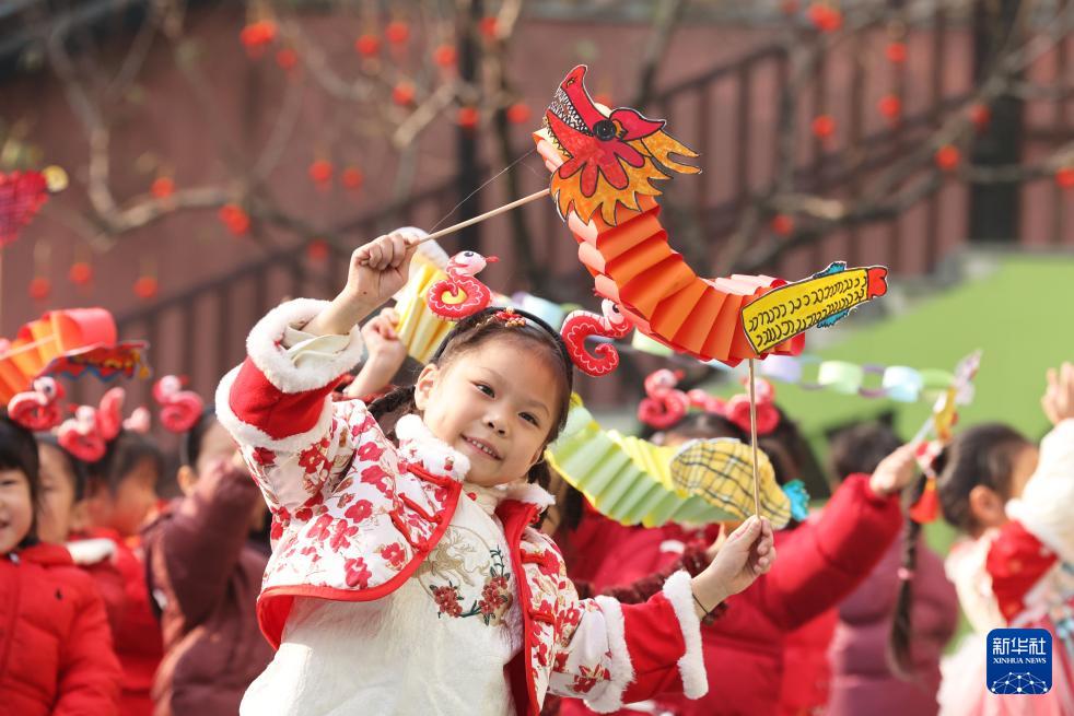 12月26日,在浙江省湖州市德清县中心幼儿园,孩子舞龙迎新年。(新华社发 倪立芳 摄)