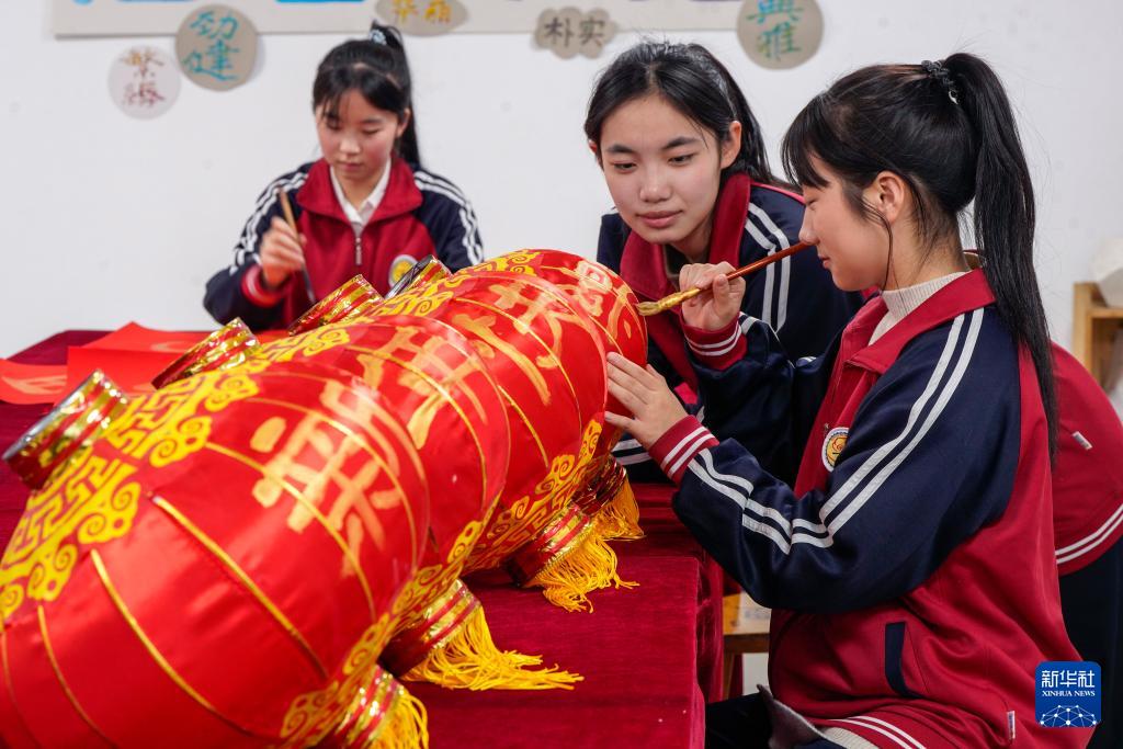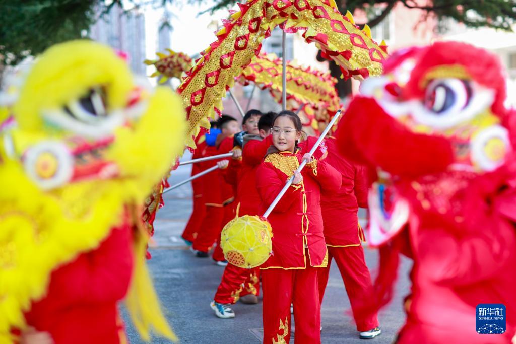 12月26日,在江苏省兴化市新生中心小学,孩子们在老师的指导下体验舞龙舞狮。(新华社发 周社根 摄)
