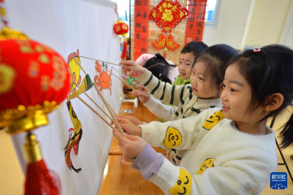 12月26日,在山东省青岛市市北区第七实验幼儿园,小朋友们在表演皮影戏。(新华社发 王海滨 摄)