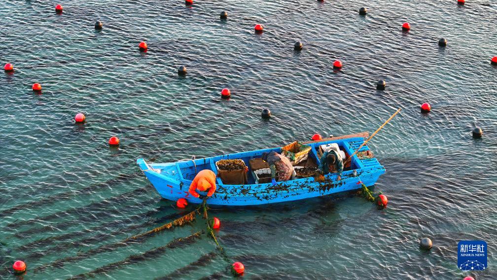 12月29日,在山东省荣成市爱伦湾海洋牧场,渔民驾驶渔船在生态网箱养殖区管理海带(无人机照片)。(新华社发 杨志礼 摄)
