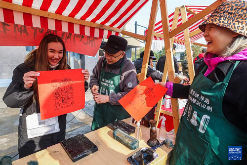 12月31日,外国留学生(左一)在年货节现场体验用雕版印刷技艺印制年画。(新华社记者 徐昱 摄)