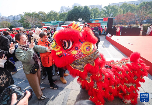 12月31日,舞狮队在年货节现场与市民游客互动。(新华社记者 徐昱 摄)