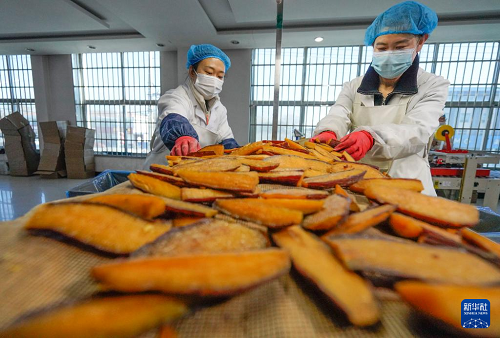 1月2日,工人在河北省遵化市苏家洼镇一家食品加工企业的车间整理红薯干。(新华社发 刘满仓 摄)