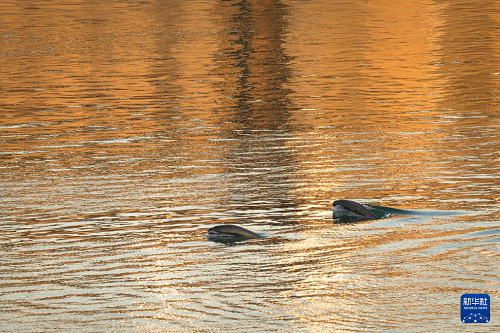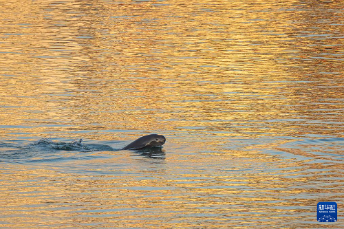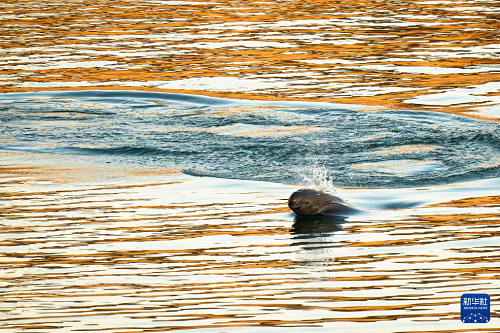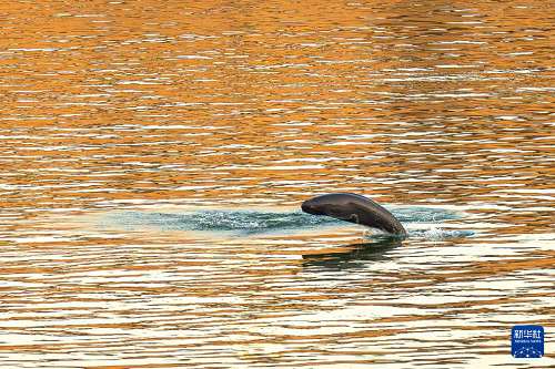 1月5日,长江江豚在长江宜昌葛洲坝下游附近踏浪前行,与浪花共舞。(新华社记者 肖艺九 摄)